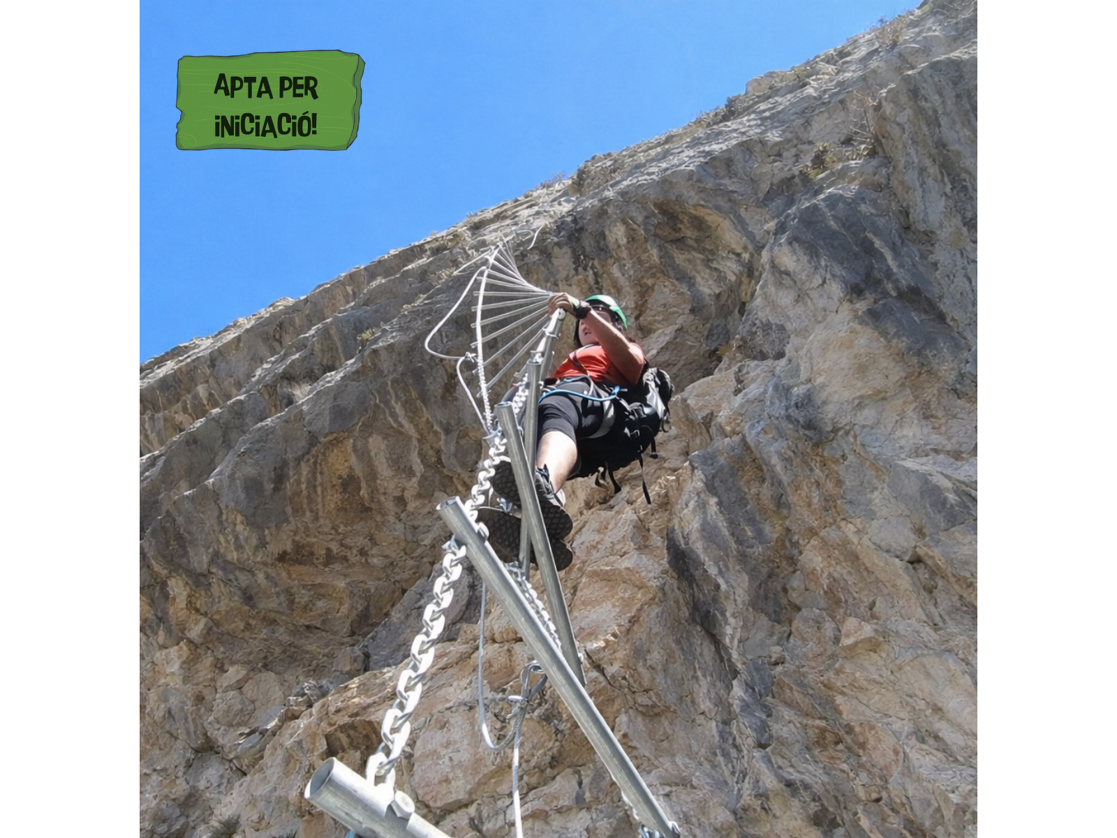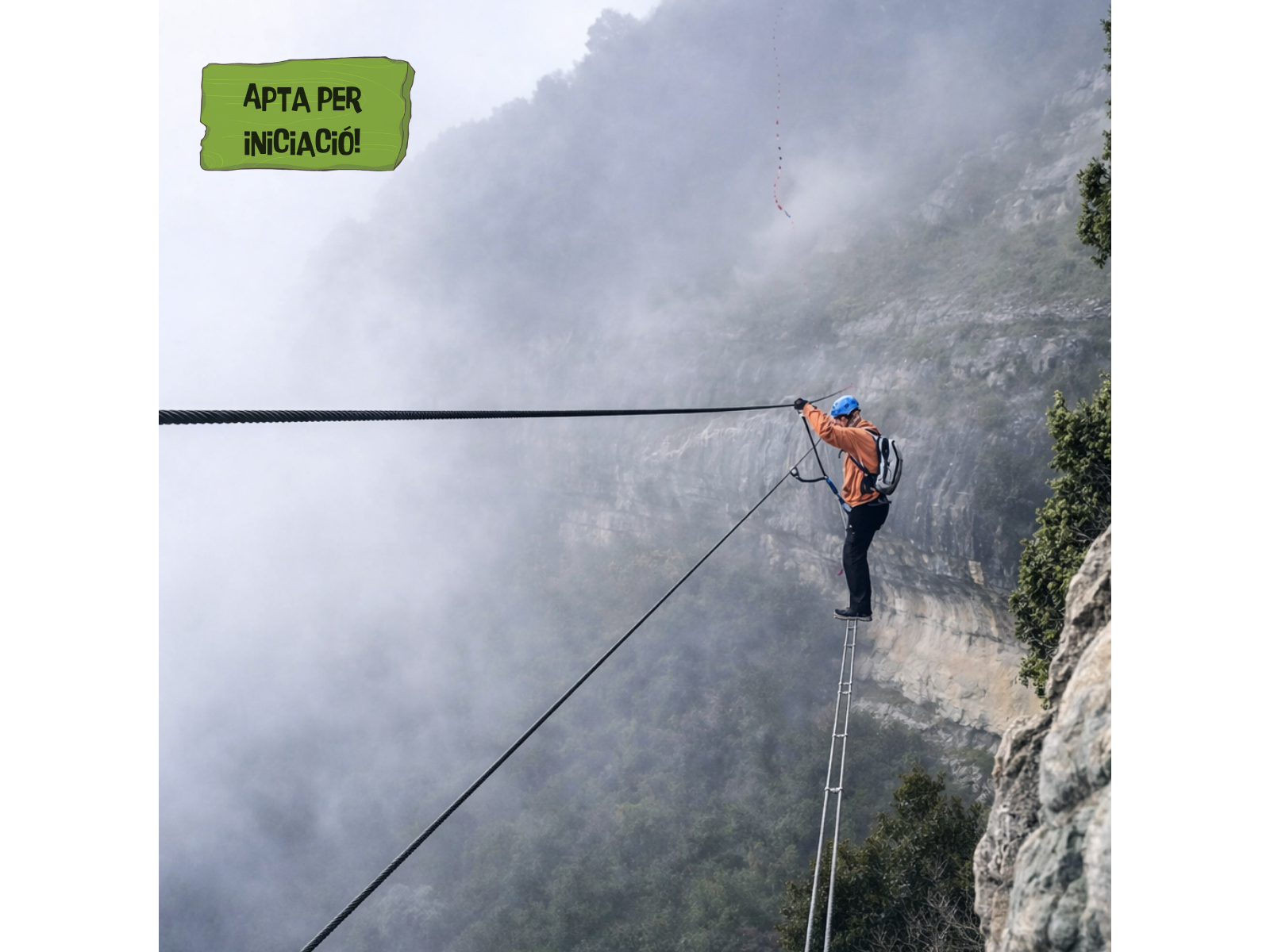 Via ferrata de dificultat progressiva amb escales flotants, ponts i algun desplom.
